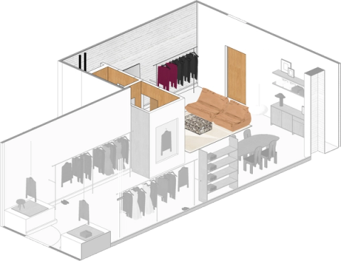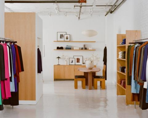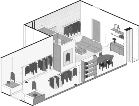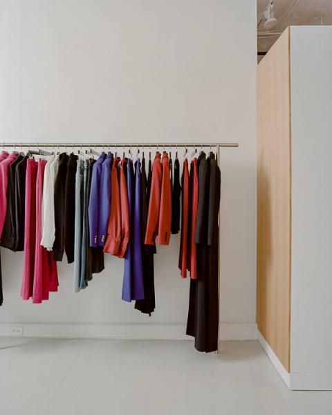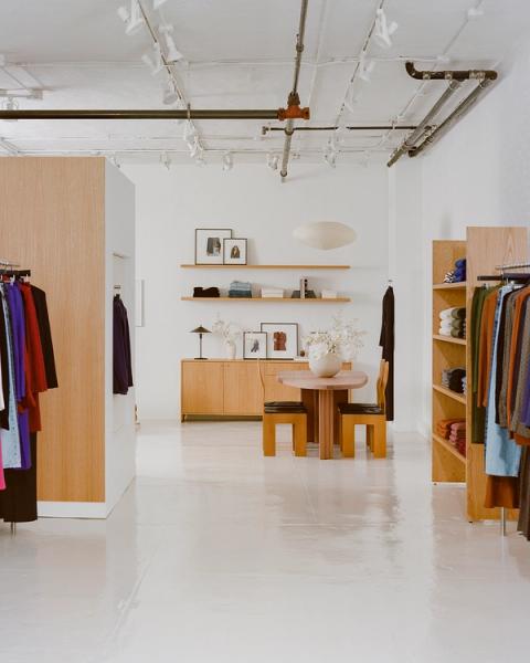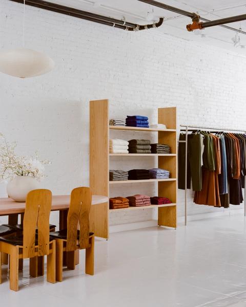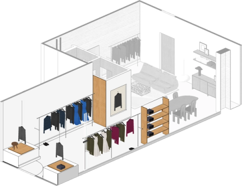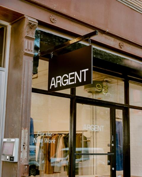 A curated closet: thoughtfully merchandised assortment showcases the spectrum of the Argent line to showcase versatility through product styling, cueing ideas for mixing and matching. Through a combination of hang rails and shelving, areas are dedicated to both Argent product and featured “editorial” showcases for new, core, and seasonal collections.
