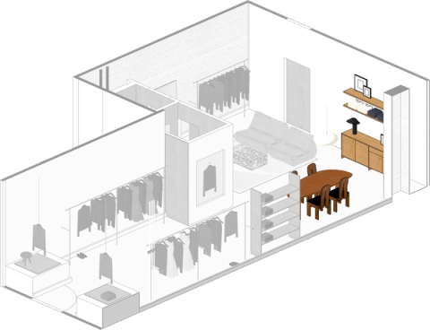 A fitting room meets lounge, with personal rooms paired with social space. Dedicated to personalized appointments, fitting rooms offer place to recharge, or charge up, during sessions. Considered lounge seating allows for interactions between groups or newly-made friends, with concierge service and a beverage always on offer.