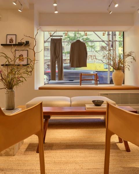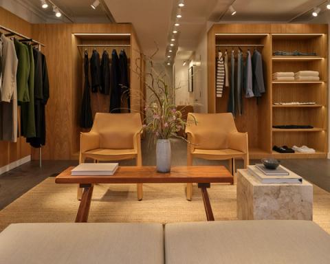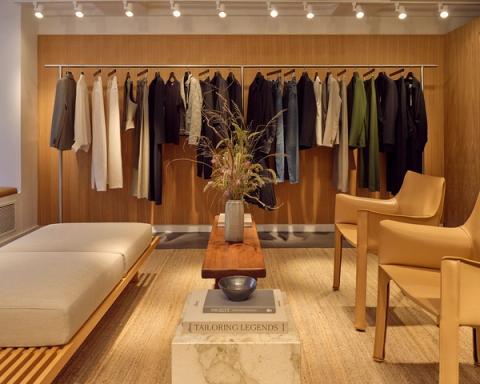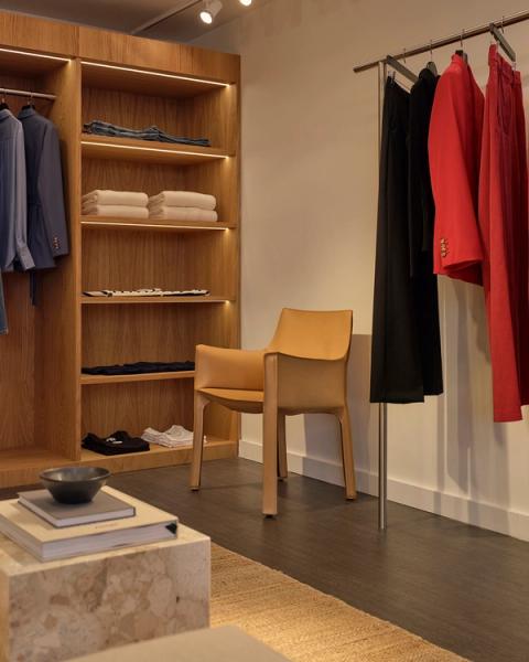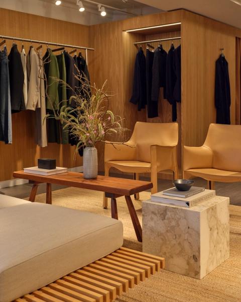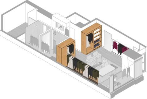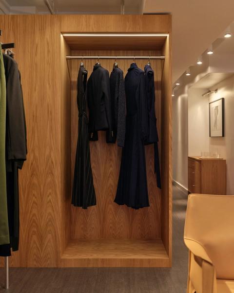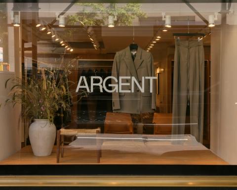 A curated closet: thoughtfully merchandised assortment showcases the spectrum of the Argent line to showcase versatility through product styling, cueing ideas for mixing and matching. Through a combination of hang rails and shelving, areas are dedicated to both Argent product and featured “editorial” showcases for new, core, and seasonal collections.