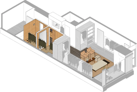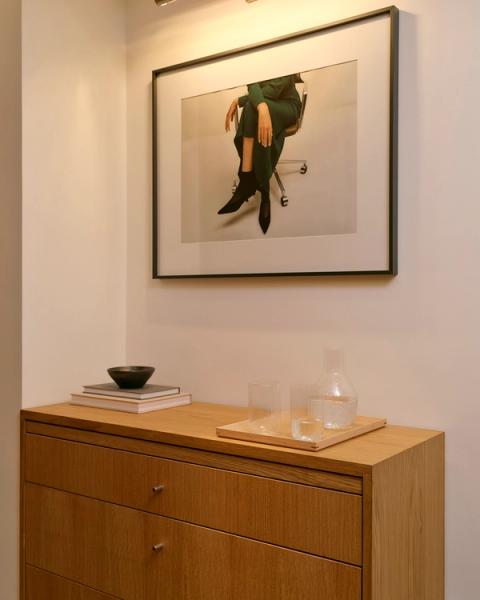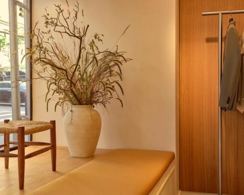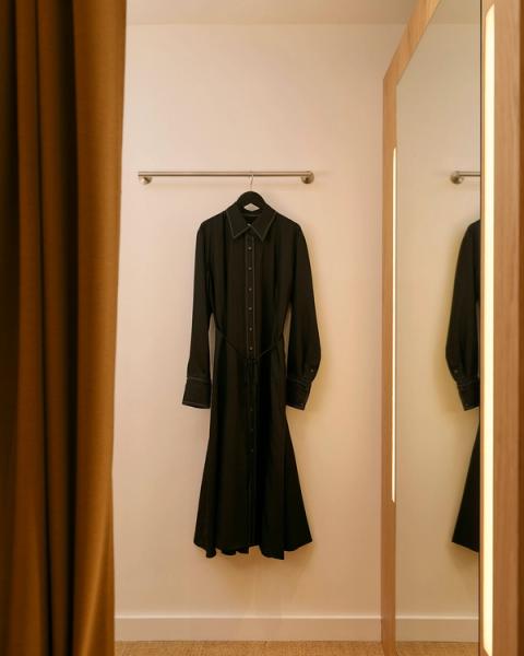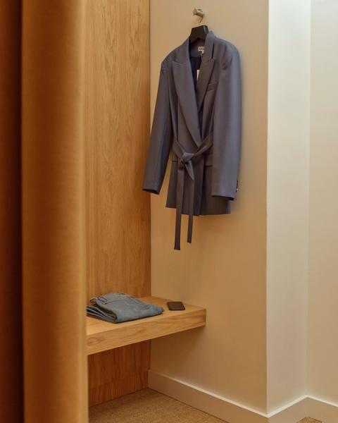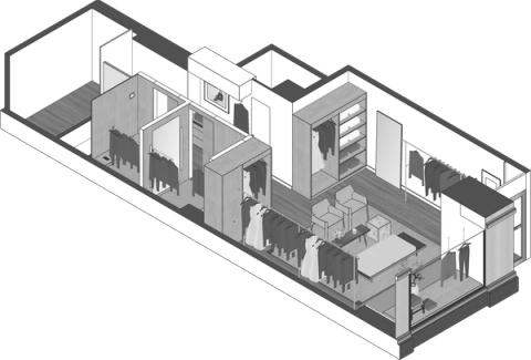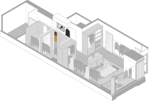 An edited point of service. A custom credenza with roll-out folding surface offers a compact point-of-service for folding and transacting.
