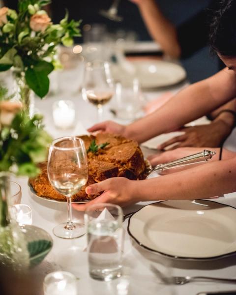 Layered on with references to past and present New York-specific restaurant culture, with a nod to the evolution of social dining in America over the past century, vintage pieces were sourced to imbue the existing space with a sense of time and memory: mid century-era wallpaper, milk glass light fixtures, and silver serving ware were all included in the presentation.